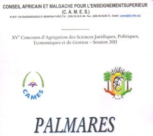 Novembre 2011 / Major au Concours d’Agrégation du CAMES (Conseil Africain et Malgache pour l’Enseignement Supérieur) en Sciences économiques